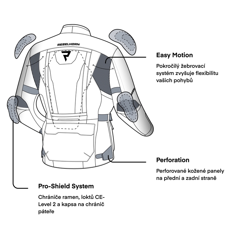 Touto volbou neuděláte chybu. Dynamická společnost z Polska nabízí moto oblečení a doplňky vysoké kvality a technické vyspělosti. Sortimentem osloví motocyklisty všech stylů. V naší nabídce najdete textilní bundy a kalhoty, kožené bundy a kalhoty, kožené dvoudílné kombinézy, cestovní a sportovní rukavice, chrániče, termoprádlo, moto boty, zavazadla, ochranné tepelné prostředky, ale i další produkty jakou jsou například plachty pro motocykly. Pro svou výrobu zvolil Rebelhorn technologie, které jsou typické u moto oblečení té nejvyšší třídy, přesto však nakoupíte za příznivou cenu a jízda na motorce pro Vás bude velkým potěšením.