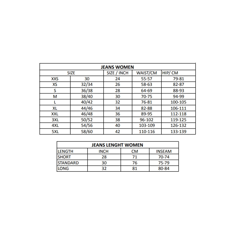 | W30/L28 | 76 - 78 | 80 - 82 | 96 - 98 | 44 - 46 | 72 - 73 |