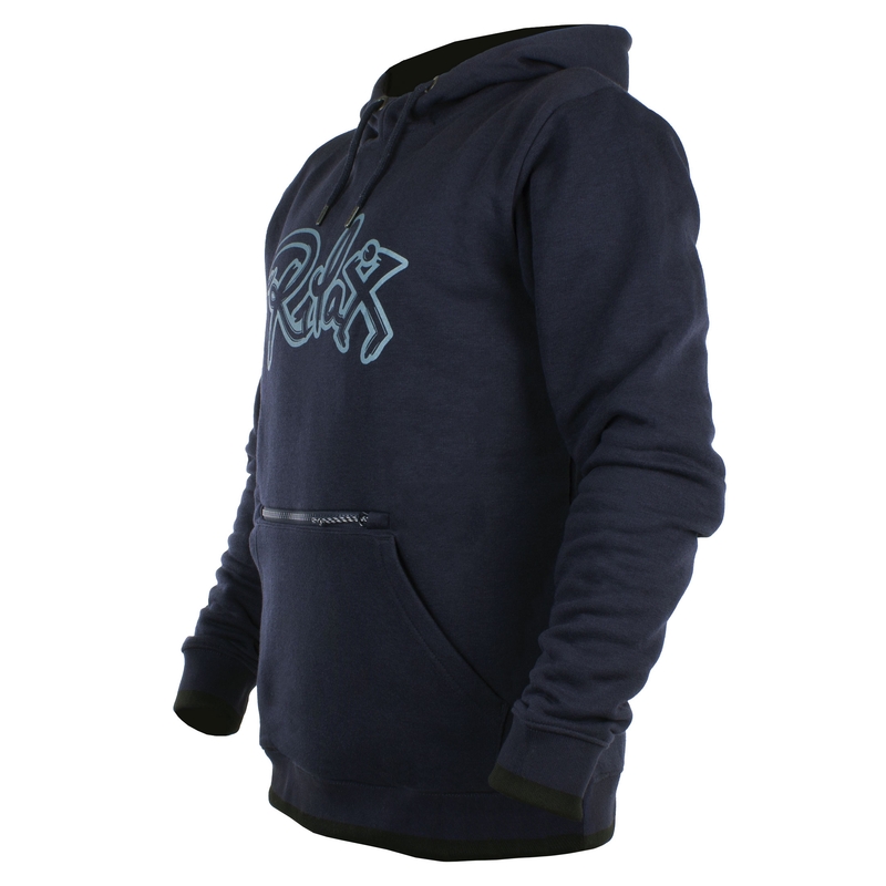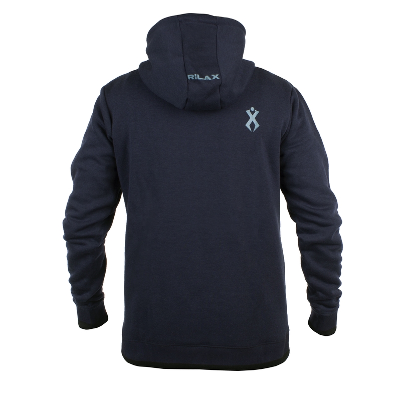 Velký nápis Rilax na prsou, drobný na kapuci a malé logo na pravé lopatce.