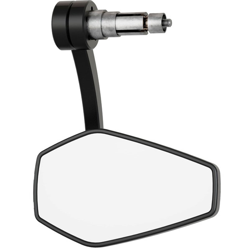 Zrcátko je vyrobeno z hliníku s perleťově pískovaným černým eloxovaným povrchem a má konvexní sklo pro jasný výhled.
